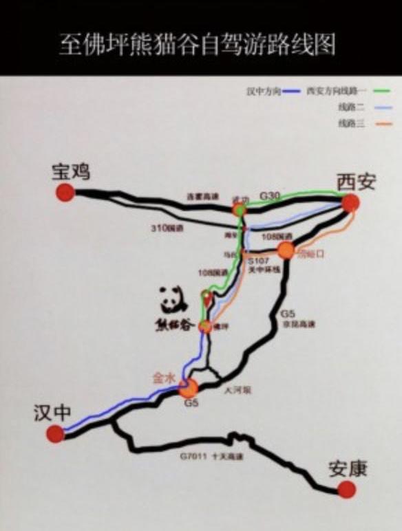 G5京昆高速--涝峪口下高速---S107关中环线--马召--108国道---佛坪熊猫谷景区(沿途有延生观、楼观台、仙游寺等景点。)橘色线